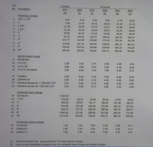 McAvoy said the proposal is brought with a “sense of urgency” to continue to find a way to provide water while having the least financial impact on customer bills. He said that the preferred proposal, the one that includes the sales tax, would result in an increase of $16 dollars a month over 5 years for a household that uses 5 CCF per month (an average number for a typical household). It would raise rates to the outside customers to the South (based on the higher cost of service to deliver water) enough to result in higher rates for them than for Fort Smith residents.